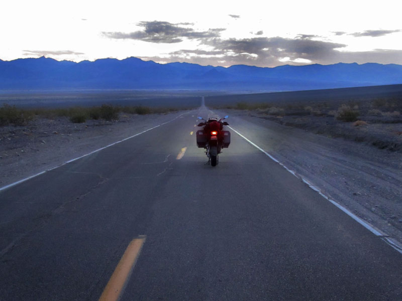 I struggled out of my hiking boots and back into my riding gear, the effort of bending over and getting boots on and off enough to set me groaning and grumbling. Swinging a leg over the saddle (ouch!), and standing on the pegs for the first rough descent was also a strain for my weary legs. I was glad to get back to pavement, settle back and just cruise the rest of the way to Stovepipe Wells.