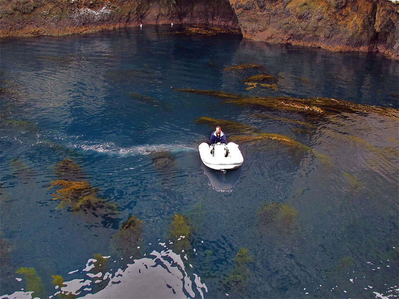 Once the anchor was down, Craiggie took to a bunk, and Michael ferried me in the dinghy. We motored along the shore looking for another landing place, and all the while he had to try to steer clear of the kelp beds. The long, ropy strands would tangle around the propeller until it cut through ("making salad," Michael called it, leaving a wake of chewed-up greenery), or we had to stop and reverse the prop, or even cut away the sinewy stems with a knife. The actual shoreline was all sharp rocks-not friendly to an inflatable rubber boat-and we circled back around for a closer look at the dock. A twisted metal ladder appeared between two of the upright pilings, and when Michael drove the dinghy straight between them, I could just reach a crossbar and haul myself up. Later I learned that a storm had battered the dock's entire structure, almost destroying the landing ladder, and at that time it was closed to visitors. The arriving naturalists had removed the sign and set it aside while they hauled their gear ashore.