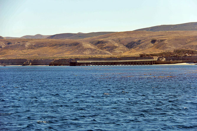 Settled in Bechers Bay, Michael ferried Chris and me ashore. The pier was massive, over 500 feet long, and had been built in 2009 at a cost of over ten million dollars. Up close you could see the engineering and construction it demanded, the thick pilings interwoven with a network of metal-gridded walkways and stairs-all of it designed to weather the area's violent storms. Unlike the steep, high ladder we had to scale on Anacapa, not to mention the storm-twisted wreckage I'd climbed on Santa Barbara, this was a much easier reach to the landing ladder.