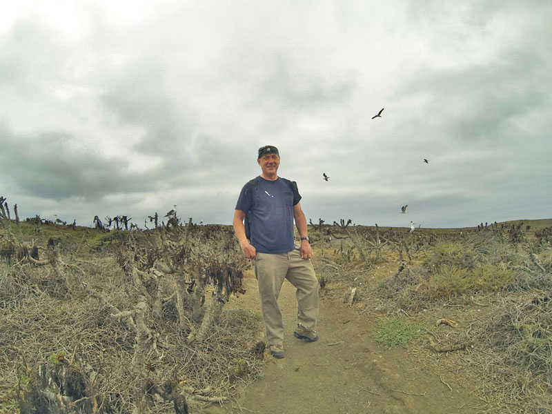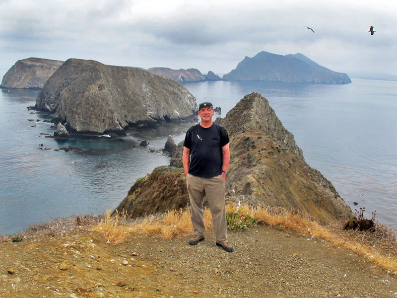 From there I followed a narrow footpath up through low, grassy vegetation toward higher ground. I am always in search of the best view, and it would not be difficult to reach on this tiny island. A few side trails were closed to protect nesting pelicans and a rare little seabird called the murrelet (ninety-nine percent of Southern California's seabirds nest on the Channel Islands), but the main trail to the island's western point was open. Unfortunately, in trying to set my camera's timer for a "selfie," I somehow switched it to low resolution, and the rest of the photos I took that day were blurry.