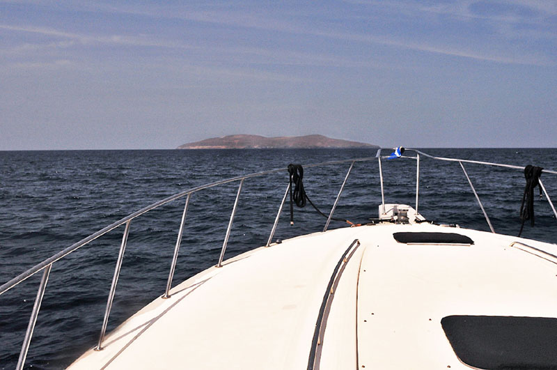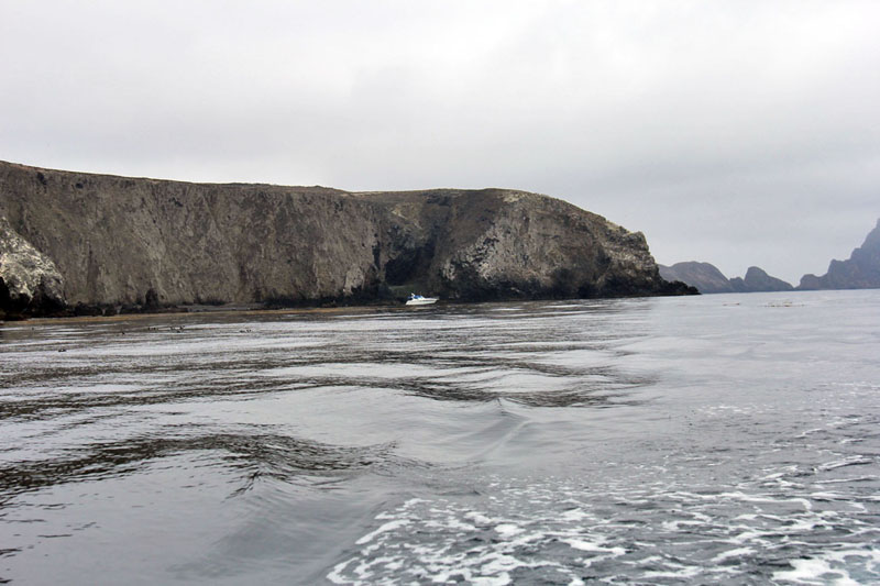 Craiggie showed up as Michael and I were filling the diesel tanks, but he was still not feeling (or looking) much better. Fortunately the wind and waves had calmed, and the sun was bright as we motored around the island's western point and cruised its shore. Soon after Catalina passed astern, I spotted the rounded hump on the horizon-my desire for so long, Santa Barbara Island. It looked barren, like most of the islands, which have no native trees save for stands of endemic Torrey pines and live-oaks on the larger ones, and a few introduced cottonwoods and eucalyptus trees planted around the former ranch buildings.