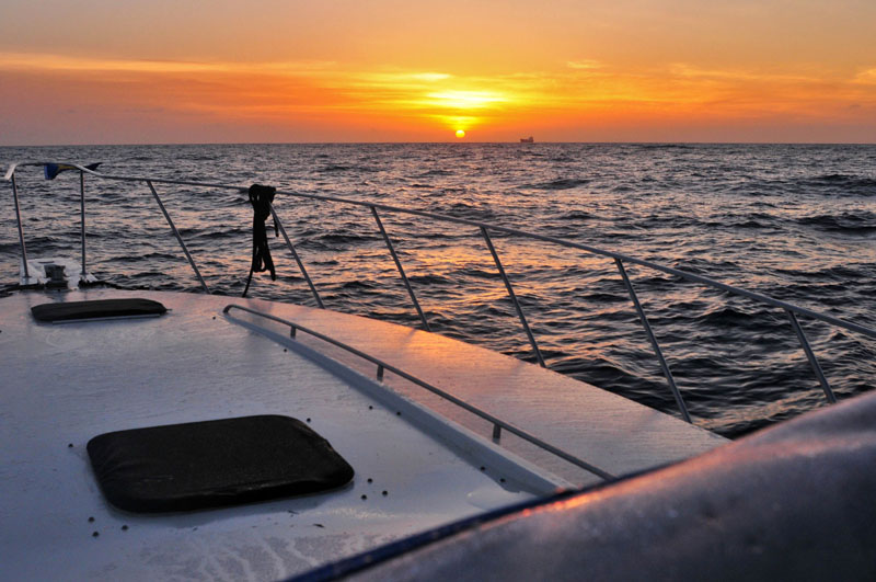 I laughed and said, "Today," and he answered, "Five, I guess. So far. A few more still to go." I learned that the two of them were stationed on the island in eight-day shifts by a non-governmental research organization, under the park service, to study the nesting birds. Back on the boat, as the sun set behind the island, we saw their silhouettes hiking back from the point, and Michael gave free reign to his fantasies.