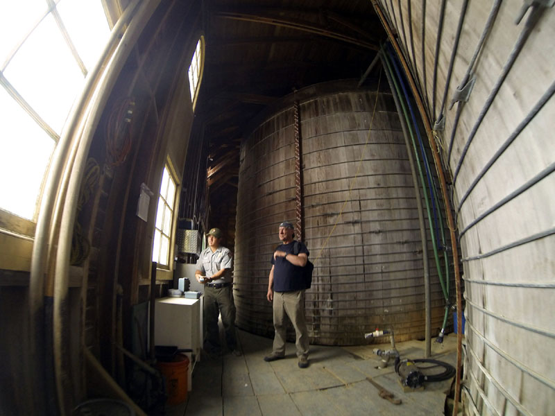 The ranger led us inside, into a vast space warm with unfinished wood and light filtered through old glass. Two enormous redwood cisterns, like huge barrels, were built by the Bureau of Lighthouses in the 1930s. They held 55,000 gallons of water, all delivered by ship and pumped up through underground pipes from the dock.
