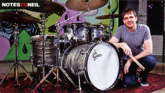 Well, the icing on the cake came soon after, when Rush played Boston and I got to witness Neil in the flesh. I caught each hit, all his movements and even his facial expressions, while studying every inch of his kit?yes, the 'Virbra-fibed' Slingerlands, Evans Glass and Hydraulic heads, Ludwig Silver Dots, Remo Black Dots and Promark sticks with the gripping area sanded down, ha ha ha. And that was before any, not every, audience member air-drummed every Neil drum fill. Is there any other drummer in history that commands that at every performance?