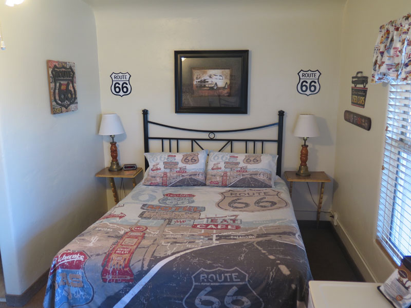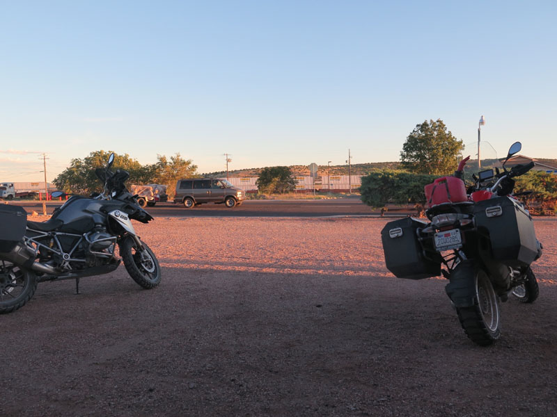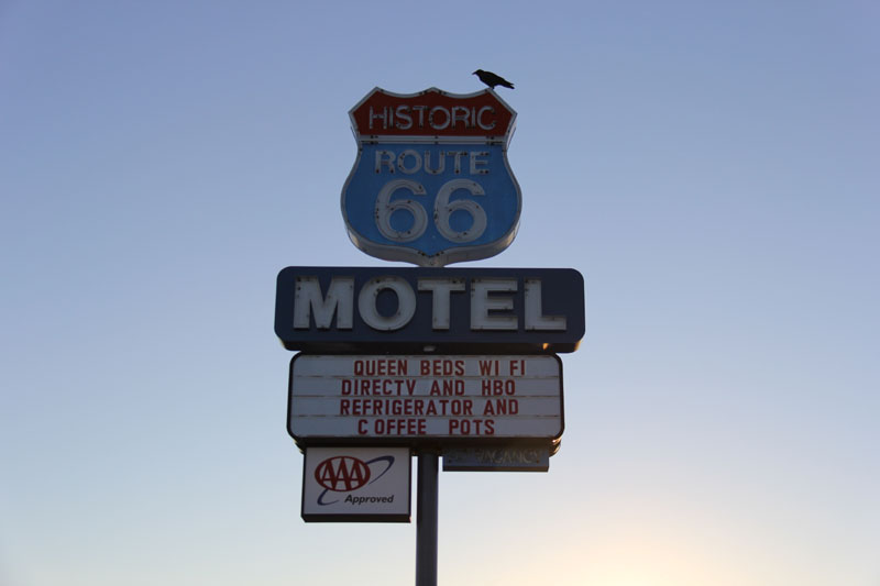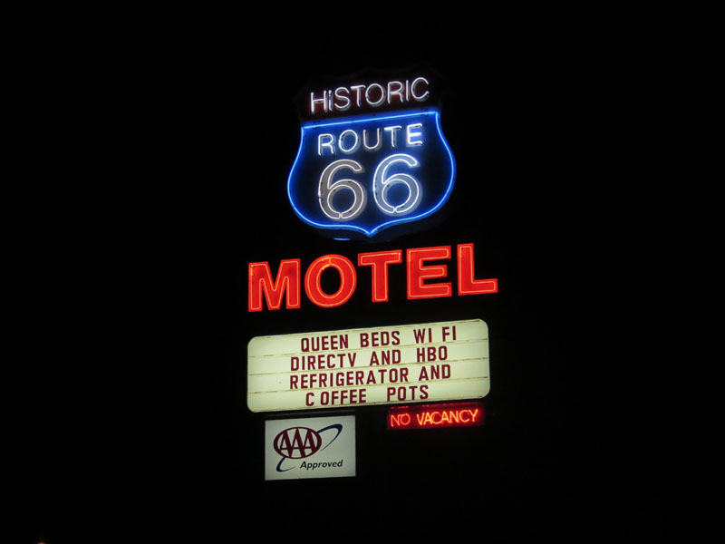 In late afternoon I sat on a white plastic chair in front of my room with the usual journal, camera, and plastic cup of The Macallan on ice. I looked out past our parked motorcycles (on their sidestands because gravel) at the occasional traffic on Route 66, behind to the Santa Fe railroad and long freight trains at intervals, and behind that to Interstate 40 and its whining semis. The story of the modern Southwest right there, really.
