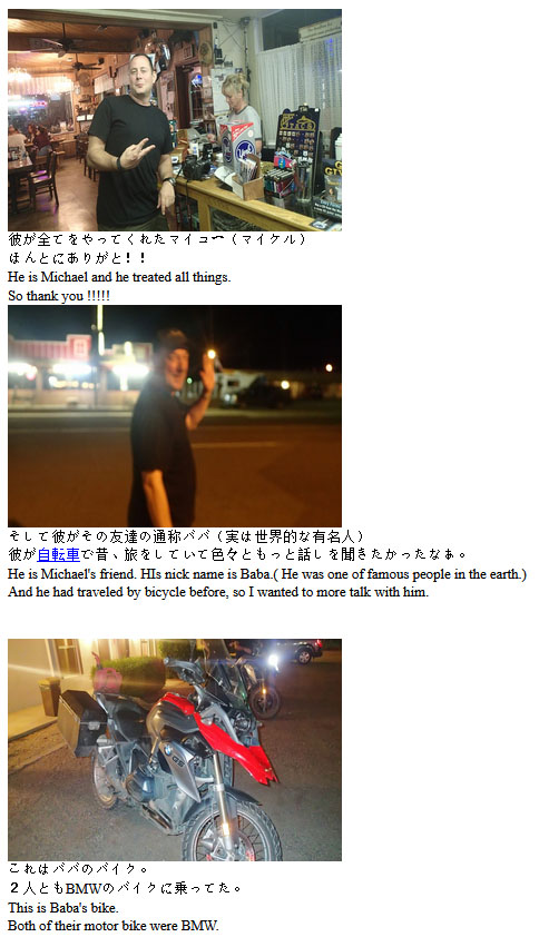 Having dined at the Roadkill Cafe on an earlier visit, we decided to try Lilo's across the road (no judgment-just for a change), and invited our new friend to join us. His name was Mine, "Me-neh," for Minekazu Ito (he presented us with his card). He was a twenty-nine-year-old high-school teacher from Nagoya (whose city flag Michael had mistaken for the South Korean), bicycling from Los Angeles to New York.