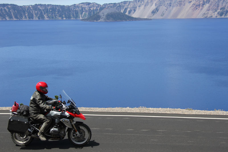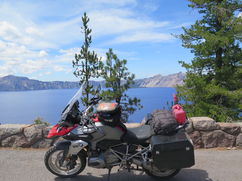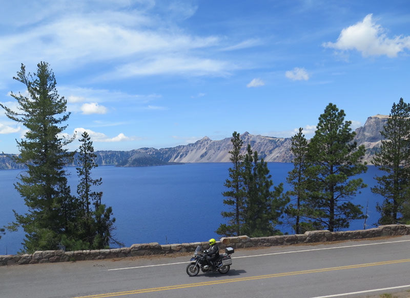 Perhaps my major ambition for that day was to get riding photos of Crater Lake. After five or six visits over the years, I had never managed to capture the "sense of place" in a single image - and if I could do that with a motorcycle passing through, that would be the ultimate. (We have ridden through and photographed some impressive walls of snow around there, towering above the plowed road even in early summer. The area gets forty-five feet of snow, so it takes a while to melt - but was all gone by July 22.)