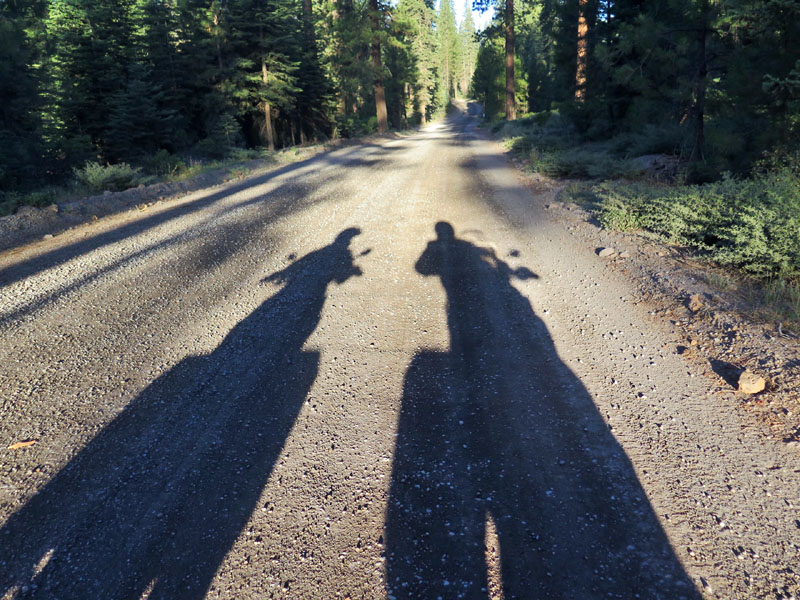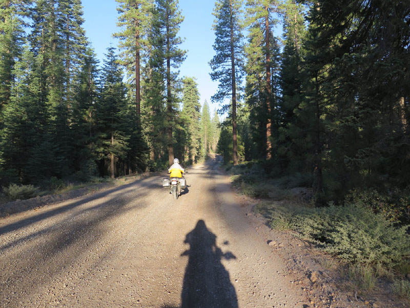 The proper unpaved route had the fetching name of Humbug Summit, but I noticed we were often on much smaller, completely unmaintained logging roads. And there was a lot of logging going on around there. Even that early in the morning we had to be watchful for oncoming trucks, gigantic roadhogs heaped with logs of ponderosa pine. Only occasionally did we encounter a few remote campgrounds, or occasional rickety cabins and parked trailers back in the woods.