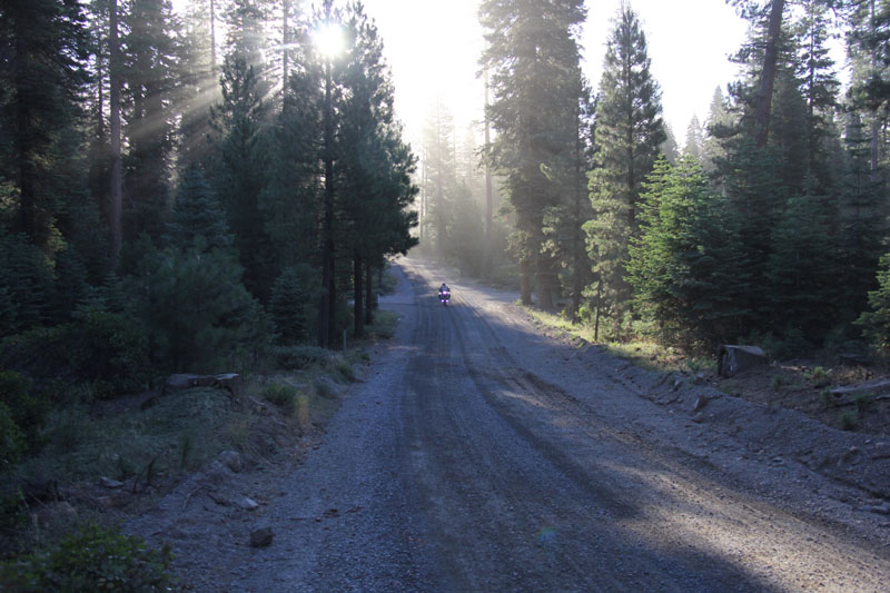 We rode around Lake Almanor to a gravel road and turned off into the mountains. This time Mother (navigation computer) had "allowed" that route, but we soon found that the Boys (onboard GPS units Doofus and Dingus) were having their problems. Or really, it was just that Mother had decided on her own interpretation of the route. Many a long-established but remote road exists but is not properly logged in her software, thus she instead chooses the roads really, really less traveled. Or like what happened to us in Montana, sending us deep into hell's half-acre, then "recalculating," and directing a U-turn.