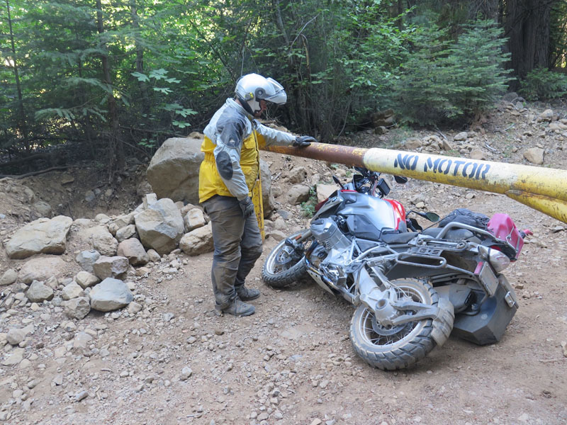 We decided to lay the bikes down, remove one of the luggage cases and a mirror, then slide them under the barricade.