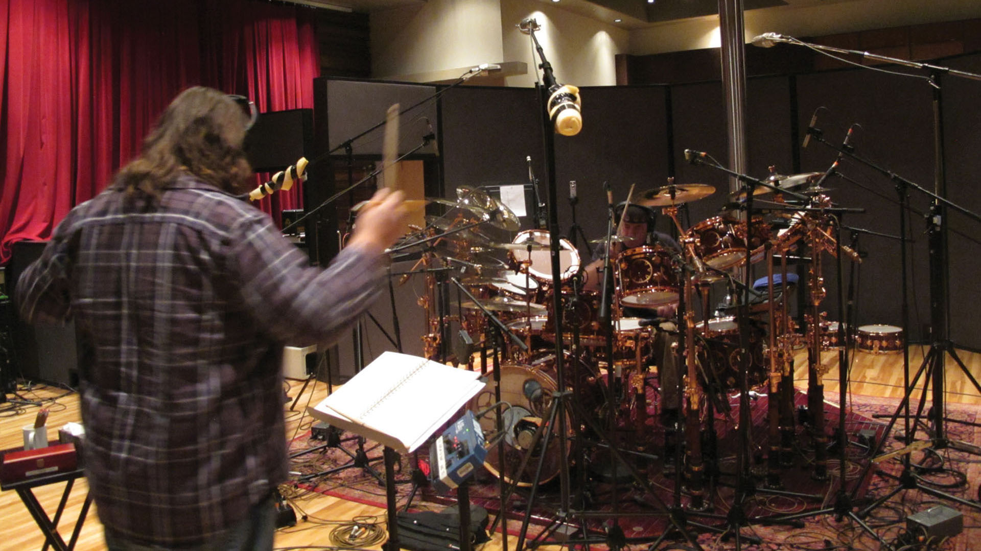 My drum parts were created in a completely different fashion than ever before. For the past few years I have been working deliberately to become more improvisational on the drums, especially in my warmups and solos, and these sessions were an opportunity to attempt that approach in the studio. It began with "Caravan" and "BU2B," which were fairly well organized before recording, but featured a number of spontaneous moments. In these more recent sessions, I played through each song just a few times on my own, checking out patterns and fills that might work, then called in our coproducer, Nick Raskulinecz -"The Mighty Booujzhe."