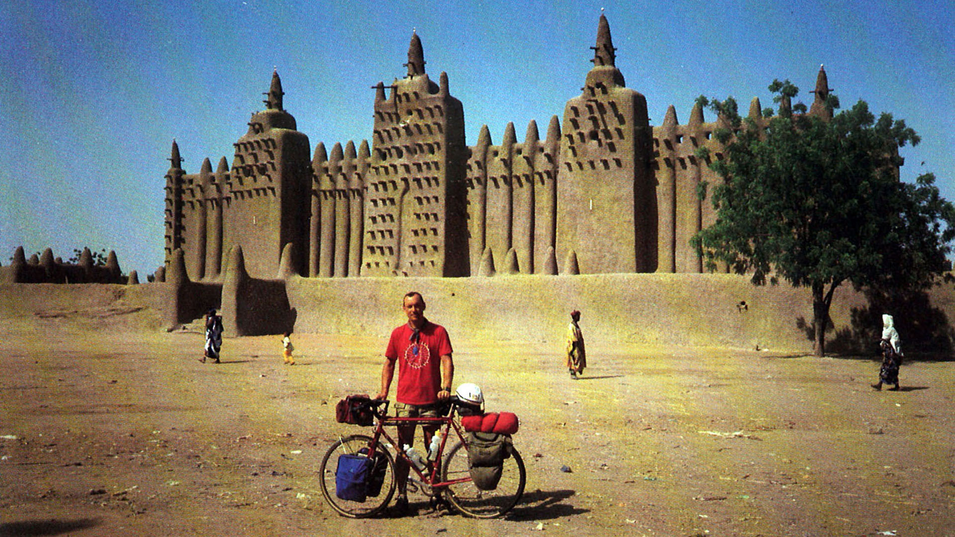 This photo was taken in October '92, during a Bicycle Africa tour of Mali, Senegal, and The Gambia. Djenne is a medieval town in the inland delta of the Niger River, not far from Timbuktu. The "Great Mosque," like the rest of Djenne, is built of mud, and every year after the rains they have to climb up and resurface that mud, using the exposed beams as scaffolding. The minarets are topped with ostrich eggs, and altogether it's about as amazing a thing as this reporter has ever seen. My friend Mendelson Joe says this photo looks like "a retired hockey player visiting another planet." And that's about how I felt - except for the "retired hockey player" part.