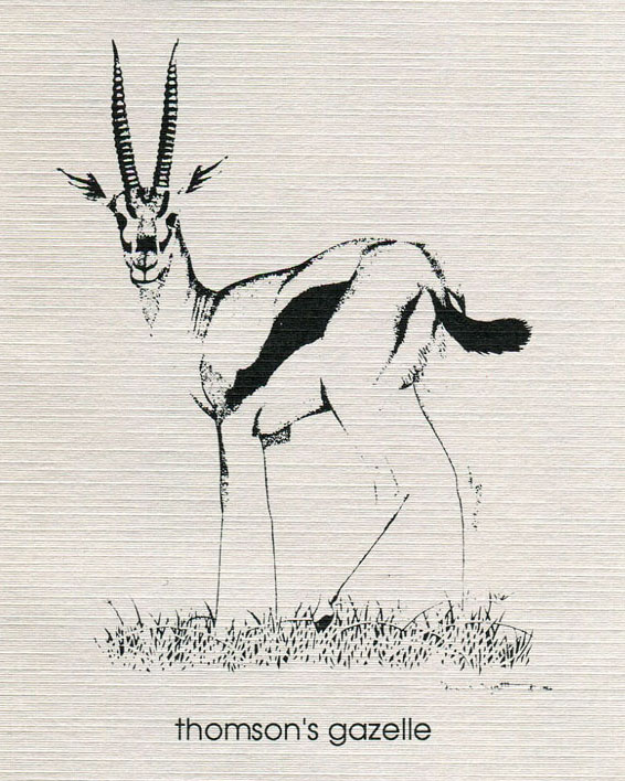 We were soon out of the humid lushness of the crater forests, continuing downhill past barren yellow hills, sometimes with a crown of green at the top where the moisture collected. After an area of rocks and thorny scrub, we were back on the bare and dusty plains. It was all on such an incredibly vast scale, mile after mile of dry savanna, yellow-brown and featureless, unbroken even by the usual thorn trees. A thick cloud of dust billowed behind the truck, soon covering us and all our possessions with a layer of grit. We passed many herds of the attractive little Thomson's Gazelles, with their long delicate horns, and trim brown bodies marked by the characteristic black side-stripe.