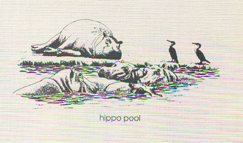 We stopped on the shore of the lake to marvel at the vast numbers of flamingos, living on tie algae formed by the alkaline lake. A small flock of white Sacred Ibis flew overhead, their black necks outstretched, and the noble Crowned Crane made a beautiful sight, with the straw-colored tiara which gives it its name. At the "hippo pool" we could see their shiny backs, and occasionally pink nostrils and ears, but they remained cool and discreet beneath the surface.