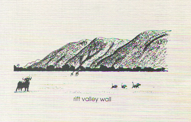 Later in the afternoon we made the long, steep climb up the wall of the Rift Valley. It was about two thousand feet high here, up a rocky dirt road winding back and forth across it. We labored upward, with baboons wandering along the dusty road beside us, then crossed a fertile plateau to the entrance of the Ngorongoro Crater Park. We had gained a lot of altitude already, and it was fertile and lush once again. By the time we climbed up even higher, to the rim of the crater, we were at eight or nine thousand feet, and were surrounded by rich and tangled greenery. We stopped on the road to gather some firewood, and enjoyed a fabulous view back over the plateau in the dwindling light.