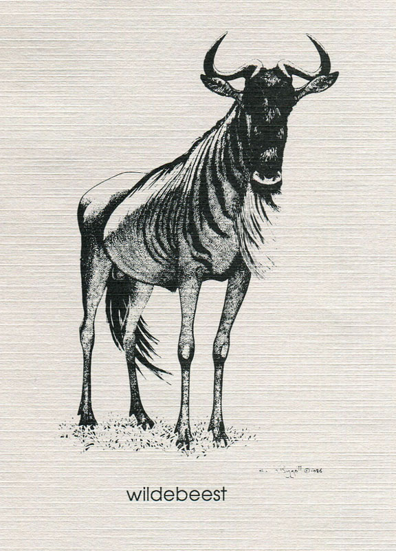 The paved road lasted about forty-miles, then we were into wilder country. Instead of goats and cattle we were seeing ostriches and zebras- our first wildlife. A huge male ostrich cavorted before his chosen hen, white wing feathers dipping back and forth in an impressive mating dance. I hadn't imagined these exotic creatures to be so plentiful, but they are one of the commonly seen wild animals. Now we were intently watching the passing landscape, and were rewarded by seeing a herd of Wildebeest, more zebras, Impalas, Secretary Birds and a giraffe. We watched many hawks and vultures circling high overhead.